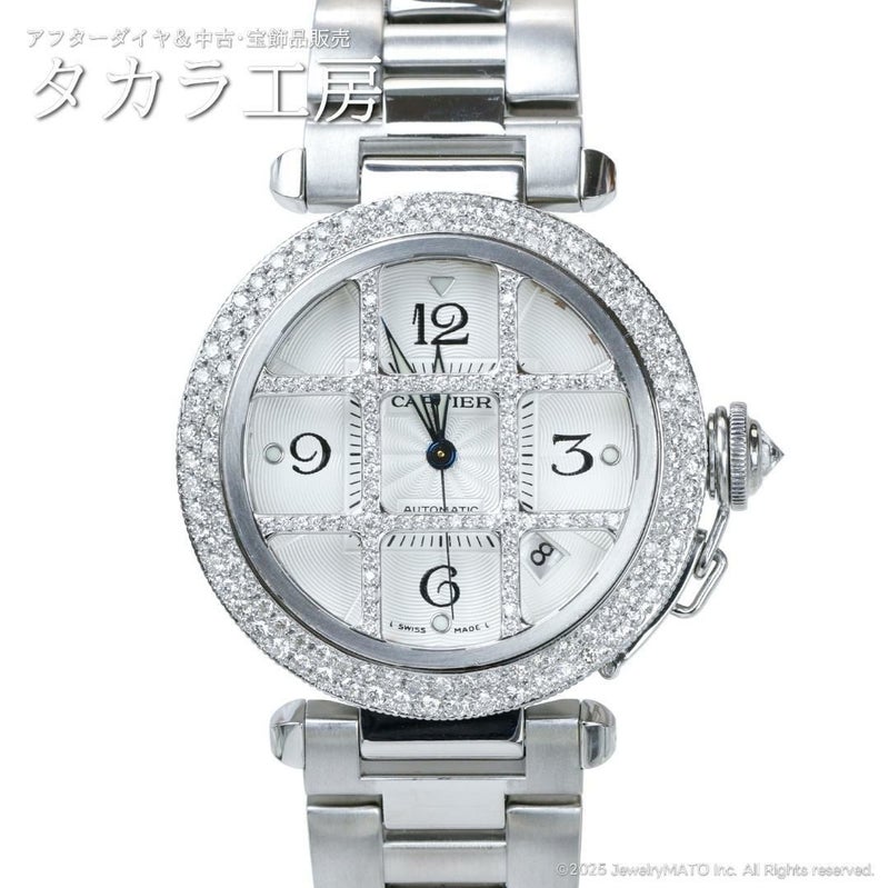 鎖で固定されたリューズガードが印象的な、カルティエの名作『パシャ』。