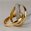 ピンクゴールド・イエローゴールド・ホワイトゴールドのそれぞれが、「愛」「忠誠」「友情」を意味する、カルティエのトリニティリング。