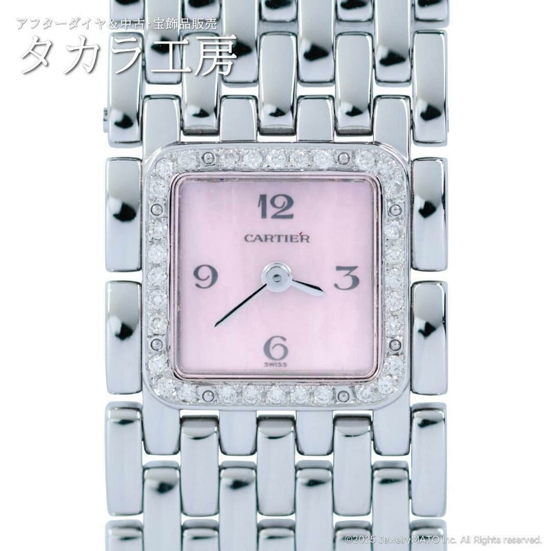 淡い色合いが愛らしいピンクシェル文字盤と、ダイヤモンドのコントラストが美しい一品です。
