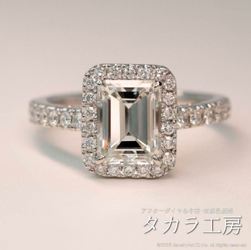 センターのエメラルドカットダイヤは、内側から湧き上がるような澄んだ透明感と、端正なラインが織りなす気品ある表情が特徴です。